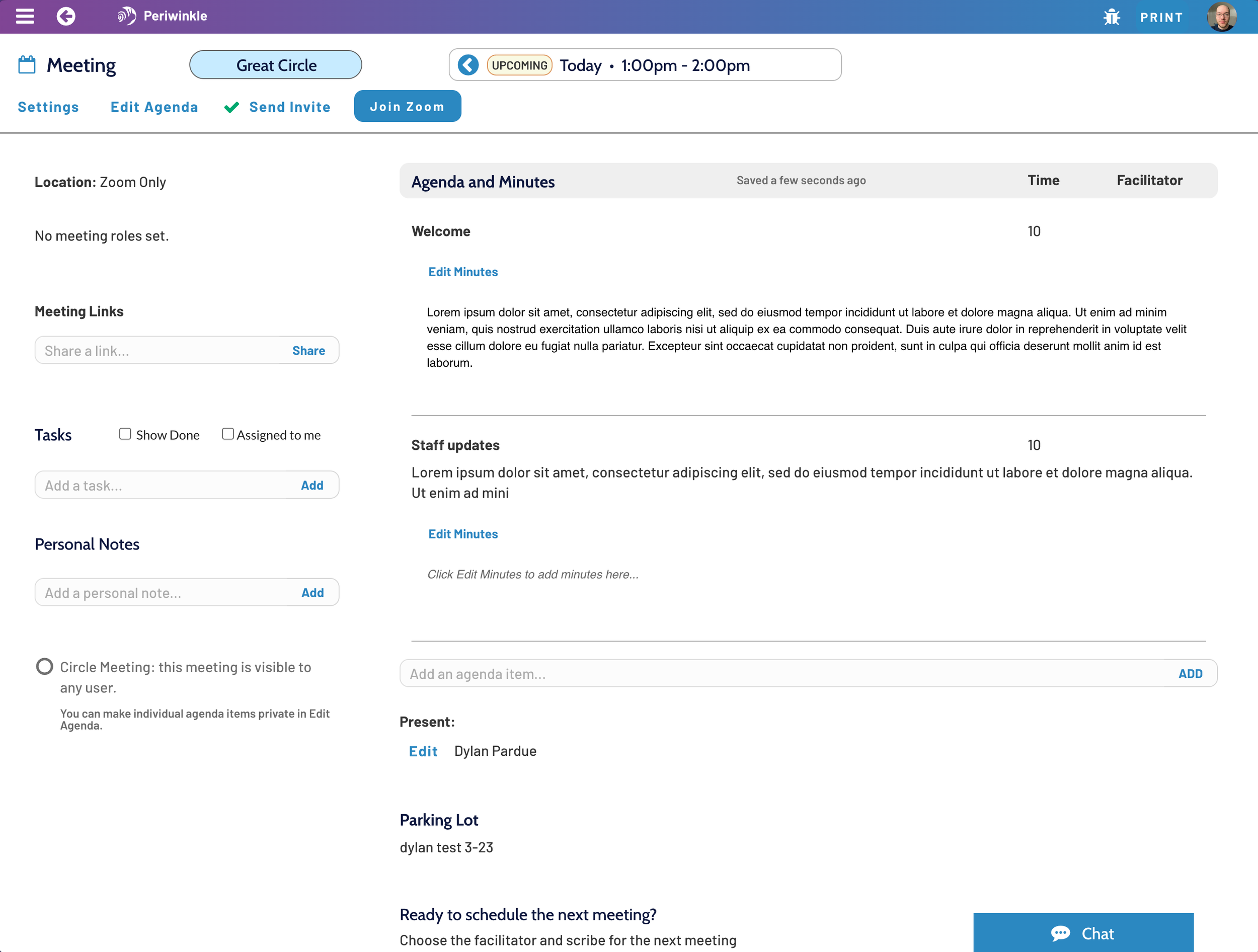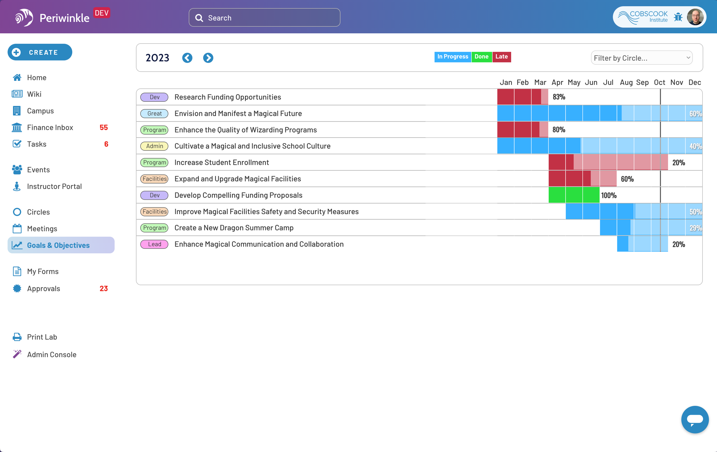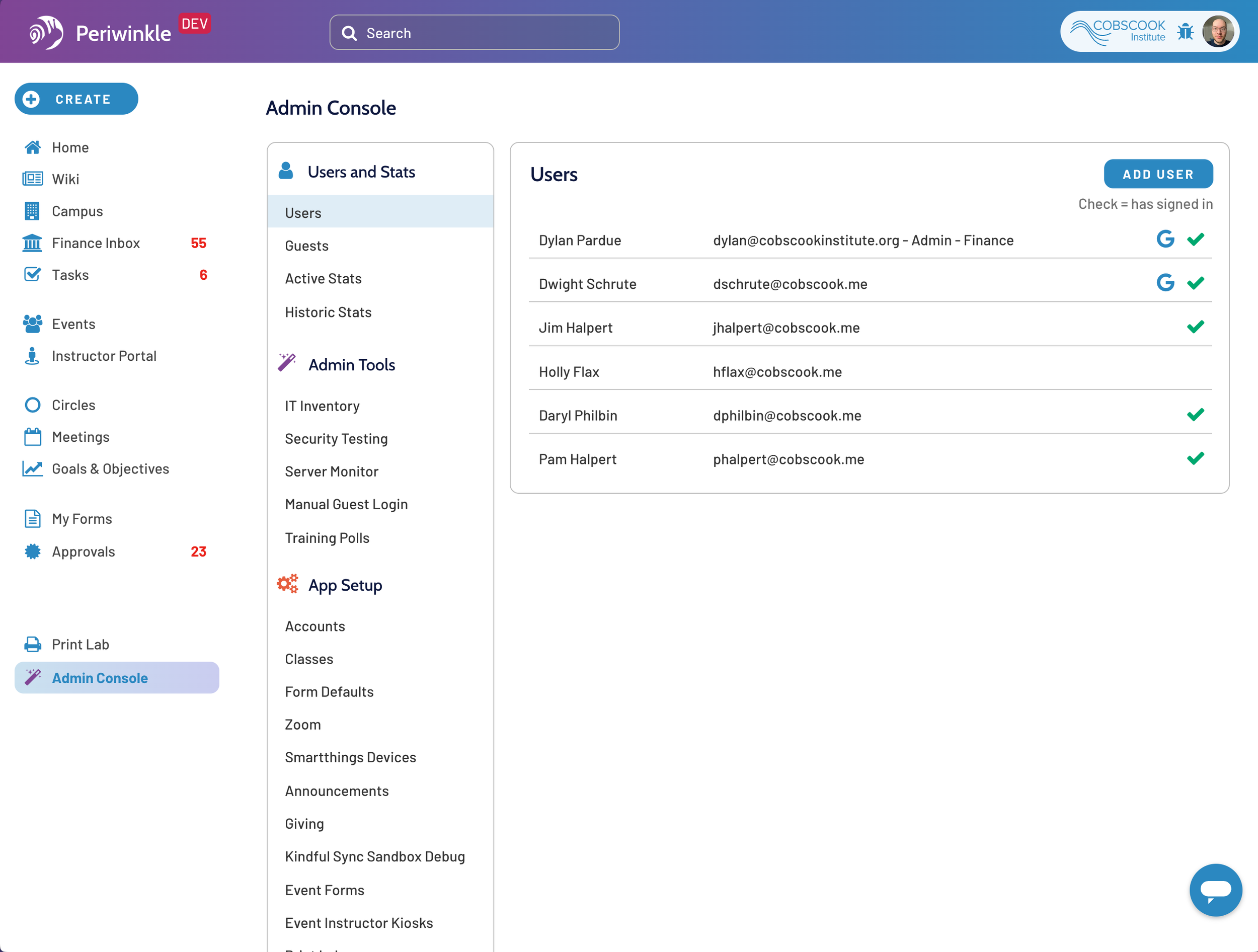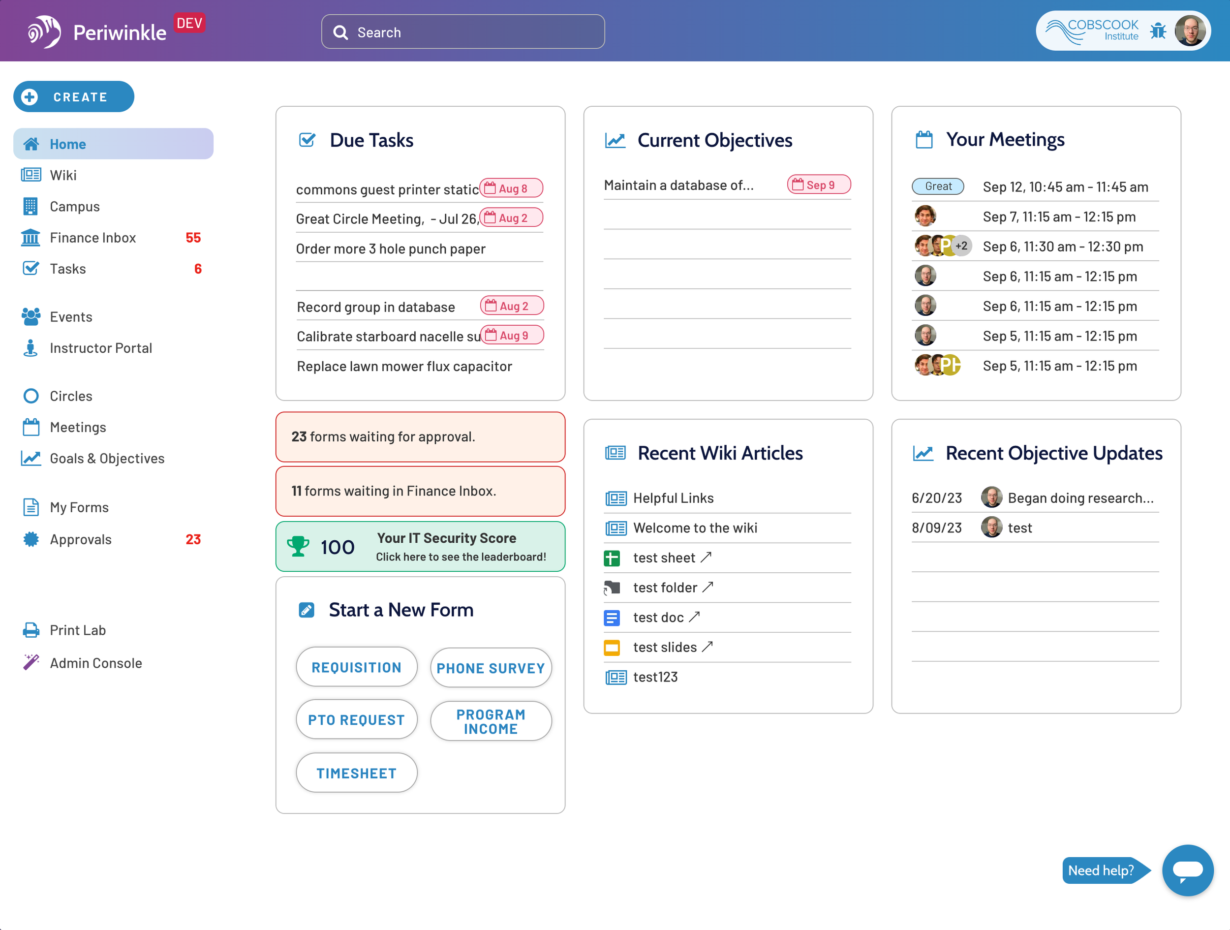 Periwinkle is a custom built web app and native mobile app for managing meetings, distributed leadership, tasks, forms, event registration, knowledge base, goals and objectives, and more at Cobscook Institute. It’s built on Bubble.